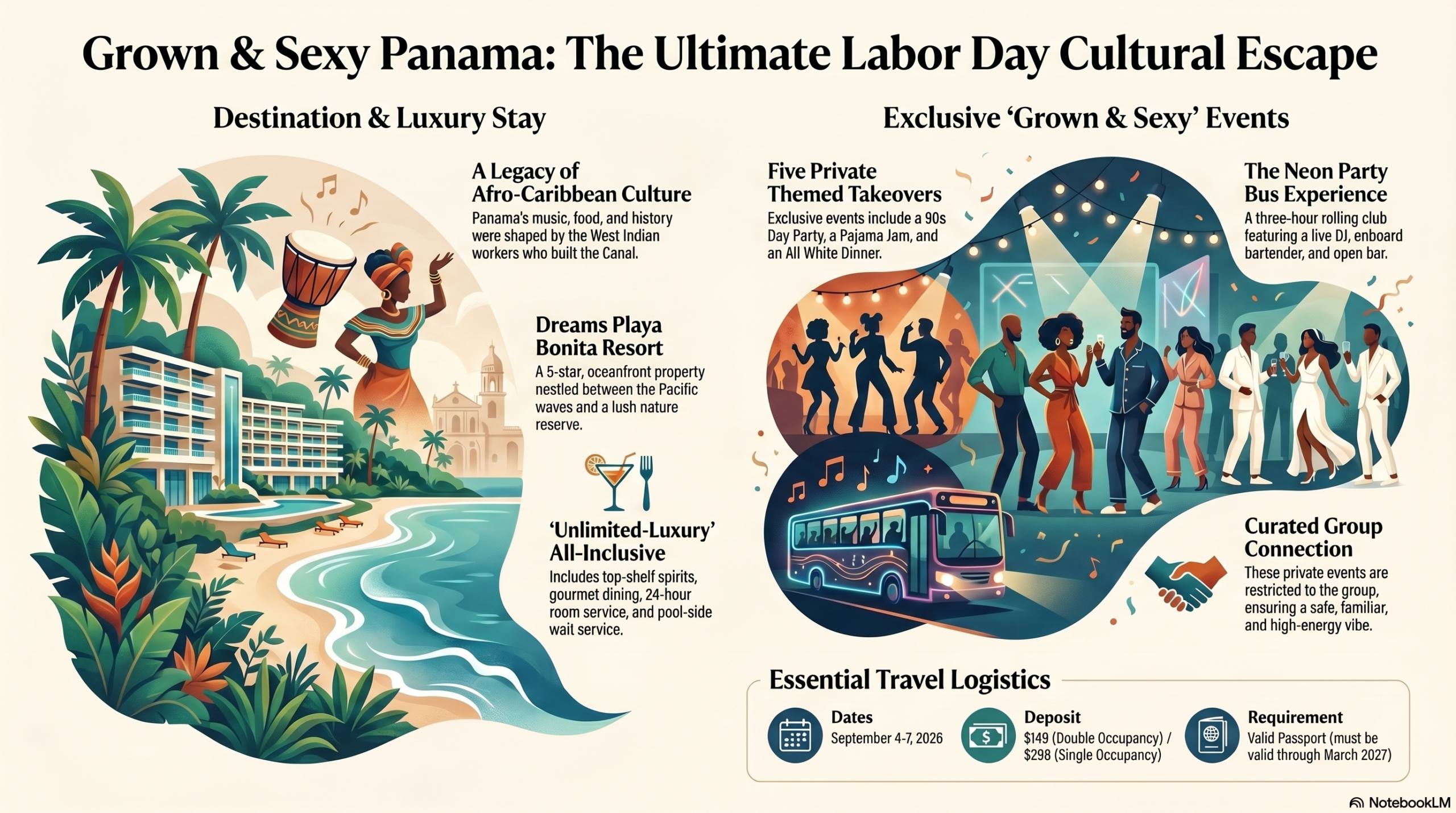 Labor Day weekend in Panama. Three nights of unlimited luxury at an oceanfront, rainforest-wrapped resort. Five private events built exclusively for our group. A destination with deep Afro-Caribbean roots, a passport stamp most of your friends don’t have yet, and the kind of weekend you’ll be talking about until next Labor Day.